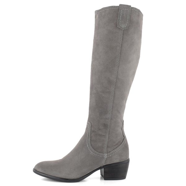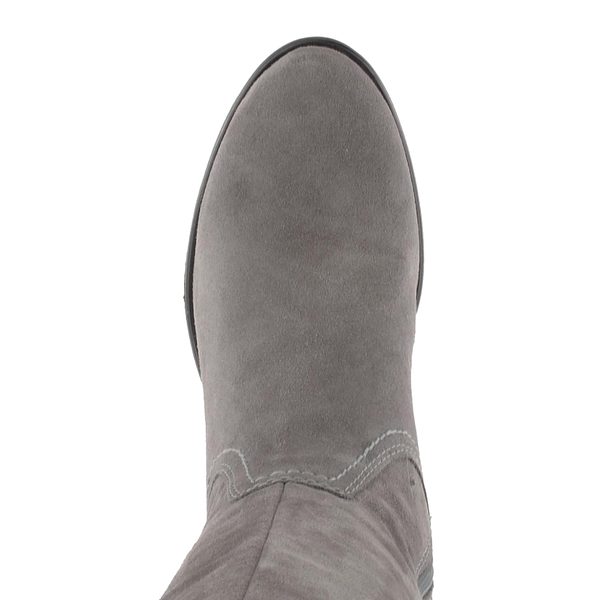 Dámské semišové kozačky v šedé barvě na středně vysokém podpatku.