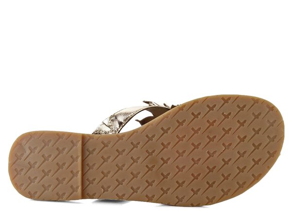 Dámské módní žabky se střapatou kytičkou, vyrobené z metalické kůže ve světle zlaté barvě.